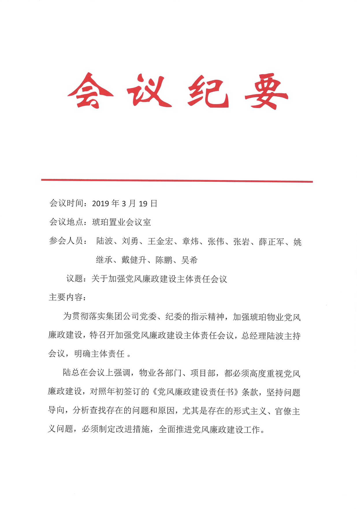 琥珀物业于2019年头,,,,,,针对公司党风廉政建设主体责任落实召开专题聚会,,,,,,凭证集团公司下发的党风廉政责任书的安排和要求组织、剖析党风廉政建设使命,,,,,,贯彻落实“三重一大”事项整体决议制度。。。。。。。